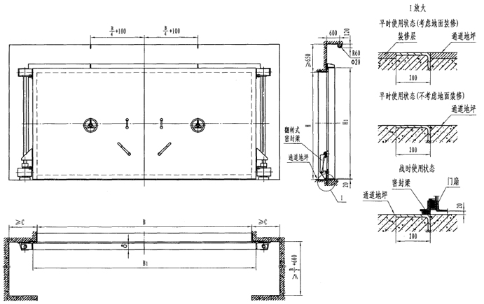 此類門設置在兩個相鄰防護單元連通口的防護密閉隔墻上。其特點是地面平整無門檻,可雙向分別受力,雙向密閉,平戰轉換快捷。