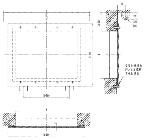 此封堵板可用于封堵平時使用、戰時不用的孔口。其特點是平時可以不安裝封堵板(但要加工好防在附近的指定位置),戰時根據事先設定的轉換時限將封堵板進行快速安裝,以滿足防護、密閉的要求。根據其設置位置的不同可分為防護單元通風口或連通口用雙向受力防護密閉封堵板(編號中無“L”)和臨空墻防護密閉封堵板兩大類。